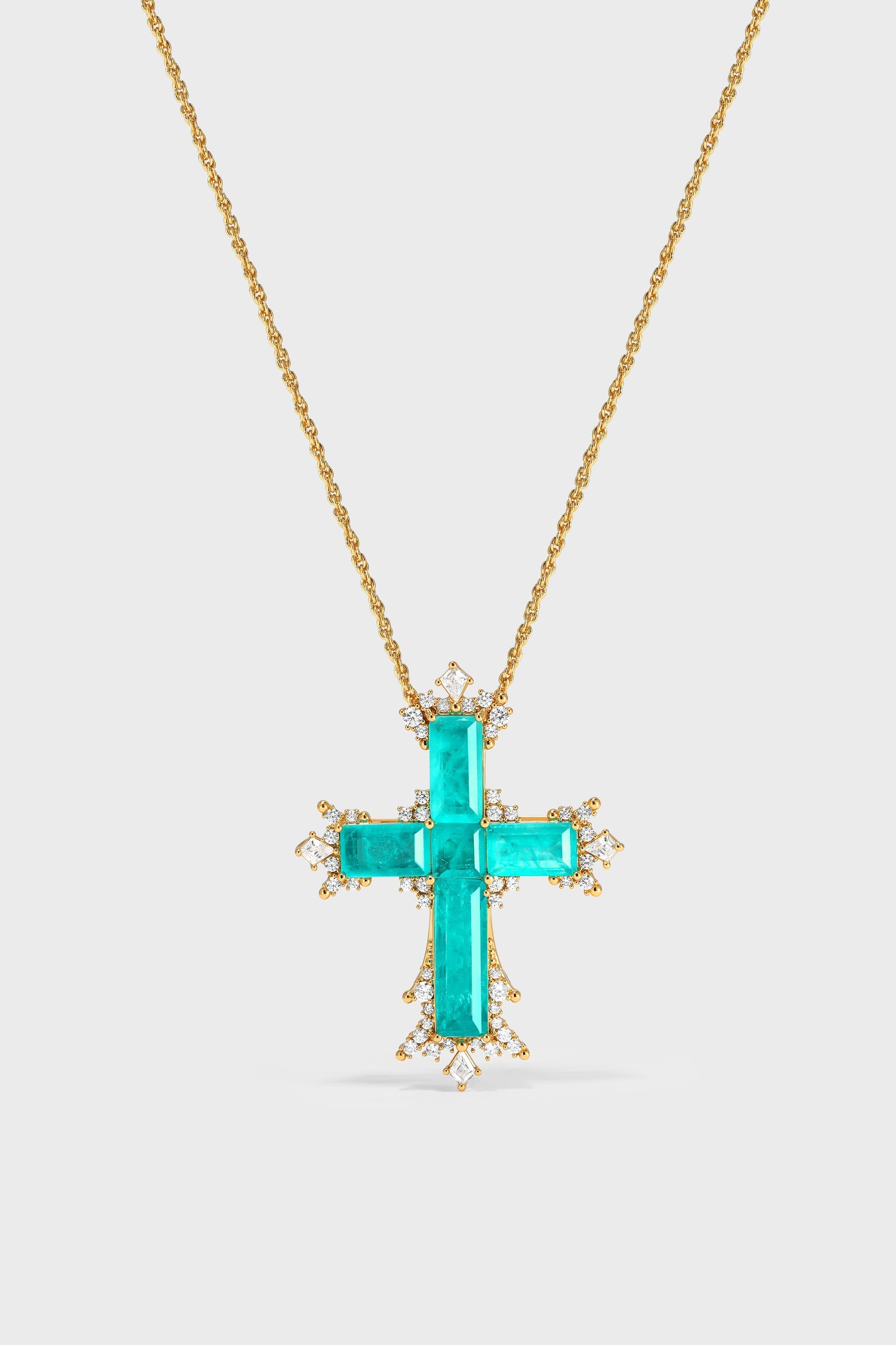 Inspired by the Mediterranean summer, the cross silhouette captures the layers of ocean blue in a timeless shape. The Paraiba-coloured ice-cracked zircon shimmers with crystal clarity, echoing the gentle movement of the waves and the shimmering tide below.